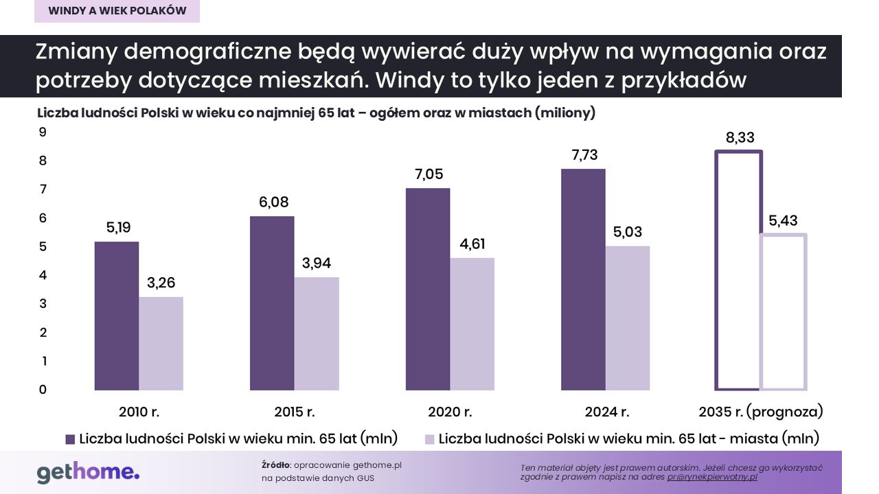 Wykres przygotowany przez ekspertów GetHome.pl sugeruje, że większą „windową” presję niż przepisy mogą wywierać tendencje demograficzne. W 2010 r. liczba seniorów (osób w wieku min. 65 lat) mieszkających na terenie miast wynosiła 3,26 miliona. Czternaście lat później – już ponad 5 milionów.